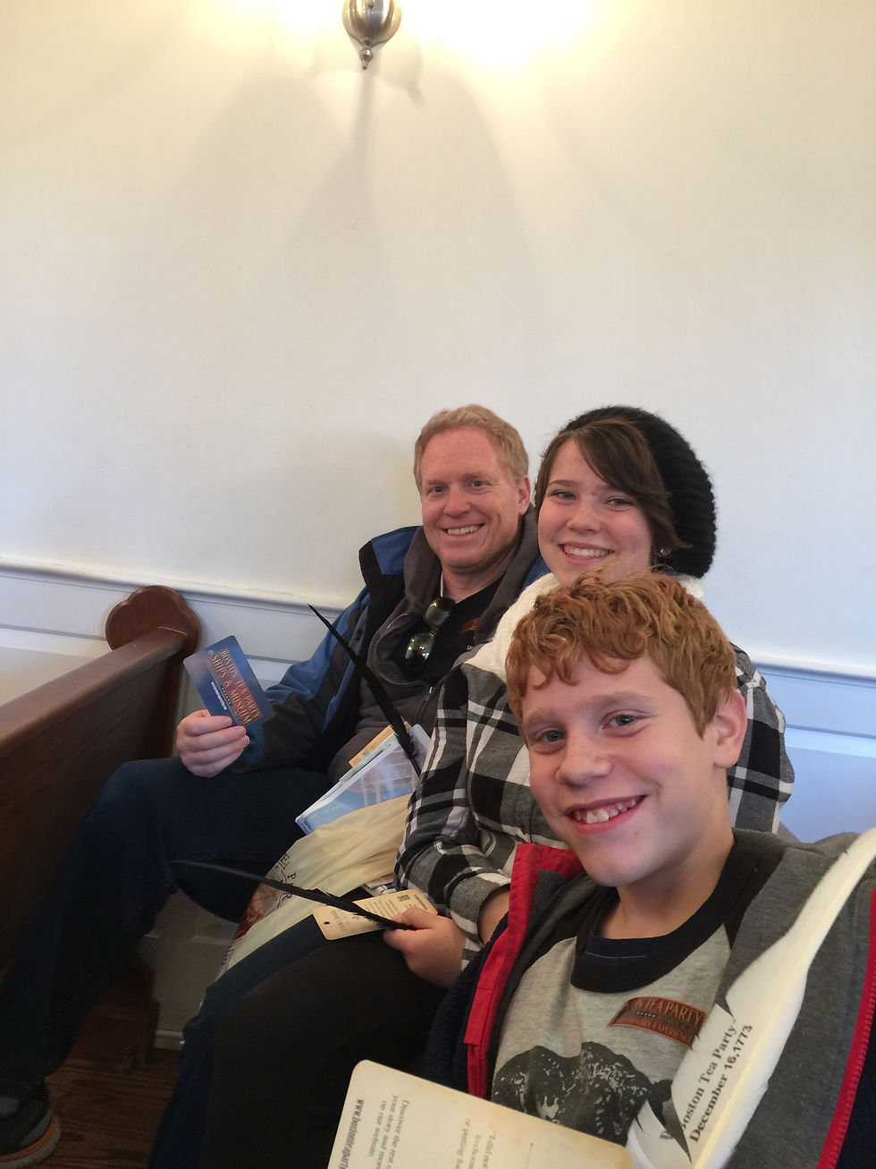 After more walking and checking out the harbour we made it to The Boston Tea Party Ships and Museum. We were just in time for the next tour. This is not your standard museum, you can only go through it if you are on tour as it is a re-enactment of the Boston Tea Party. We start in the Meeting Hall, which originally started at Faneuil Hall, but had to be moved to the Old South Meeting House because the crowds were too large (5000 to 6000 people). Each person on the tour is given new identities, and some people are given lines. Isaac volunteered to be a speaking participant, which was not a huge surprise. He had two or three lines to deliver during the meeting.