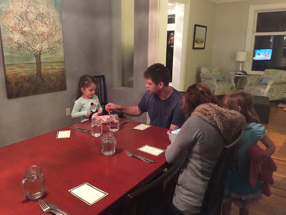 Natasha was making stuffed peppers, so everything had to be cooked before it was put in the peppers and into the oven. This allowed Suzanne to prepare plates of foods for her kids with the individual ingredients, because they probably wouldn’t eat stuffed peppers anyhow. While Natasha assembled everything for the final phase the little one’s had their supper. She then started on the salad and we had salad while the main courses finished cooking. Everything was really good, Natasha did a really good job. It was just very late when we ate, so she learned a lot about prepping and starting things earlier. The two main dishes could have been prepared earlier in the day and then just put in oven when it was close to supper. These are things that are learned with practice doing everything yourself a few times. Natasha then started on the dessert, which was mainly prepped. She just had to do the filling for the apples and throw them in the oven.
