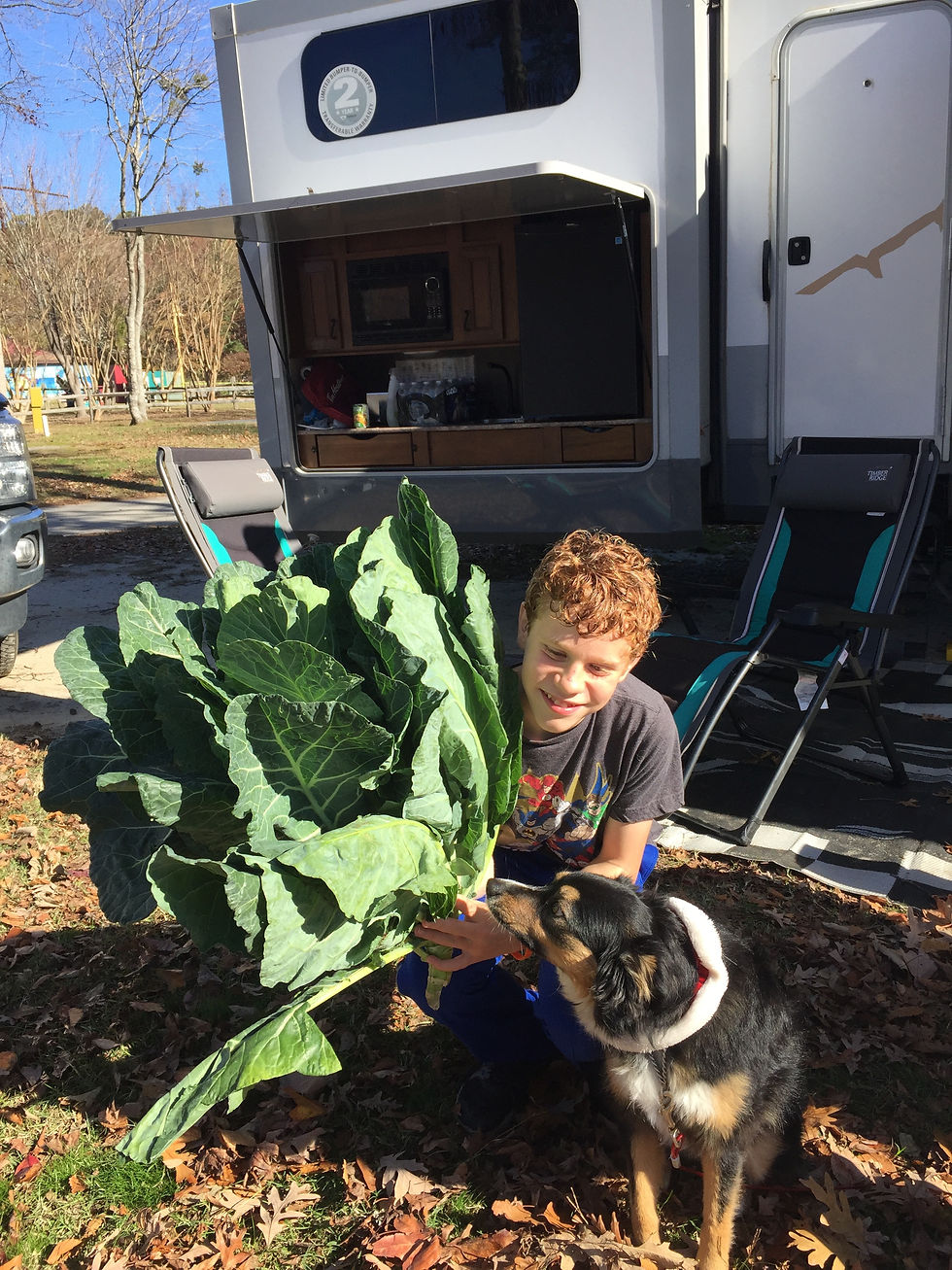 Blake and Isaac got to work on the collard greens in the morning. The lady at the vegetable stand told us to cook them overnight in the crockpot with hog jowls, but I didn’t get any of those. We will just cook them in the crockpot and hope for the best. Here is a picture of them:
