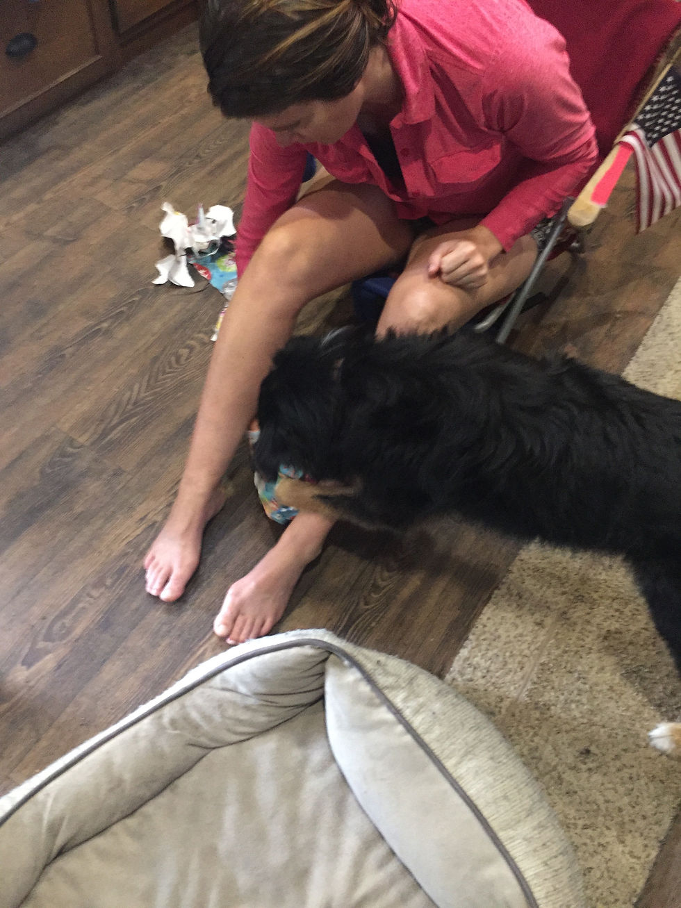 It was time for me to open presents after that. Blake and the kids are making me High Tea for my birthday, later this afternoon. Kizmet was super excited about me opening the presents and got right in there to help out: