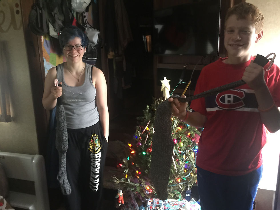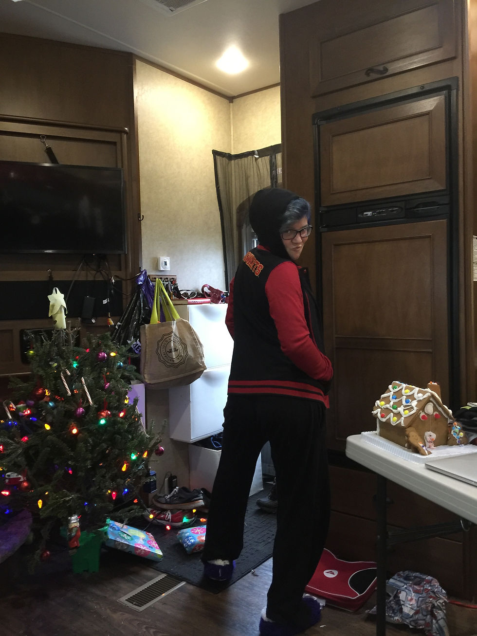 Today was a pretty casual day in the Reid RV. The kids didn’t get up until after 8. Kizmet had us up at 7:30 or so, so we had a nice sleep in. Blake got up and put the kettle on for tea and took Kizmet for her morning stroll. By the time he came back our Christmas Morning Tea was steeping and we got back in bed to enjoy our cuppa. It’s our favourite way to start the day. Isaac was up by this time and he came in to regale us Isaac style.