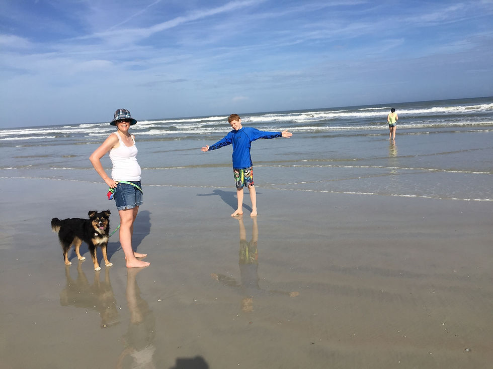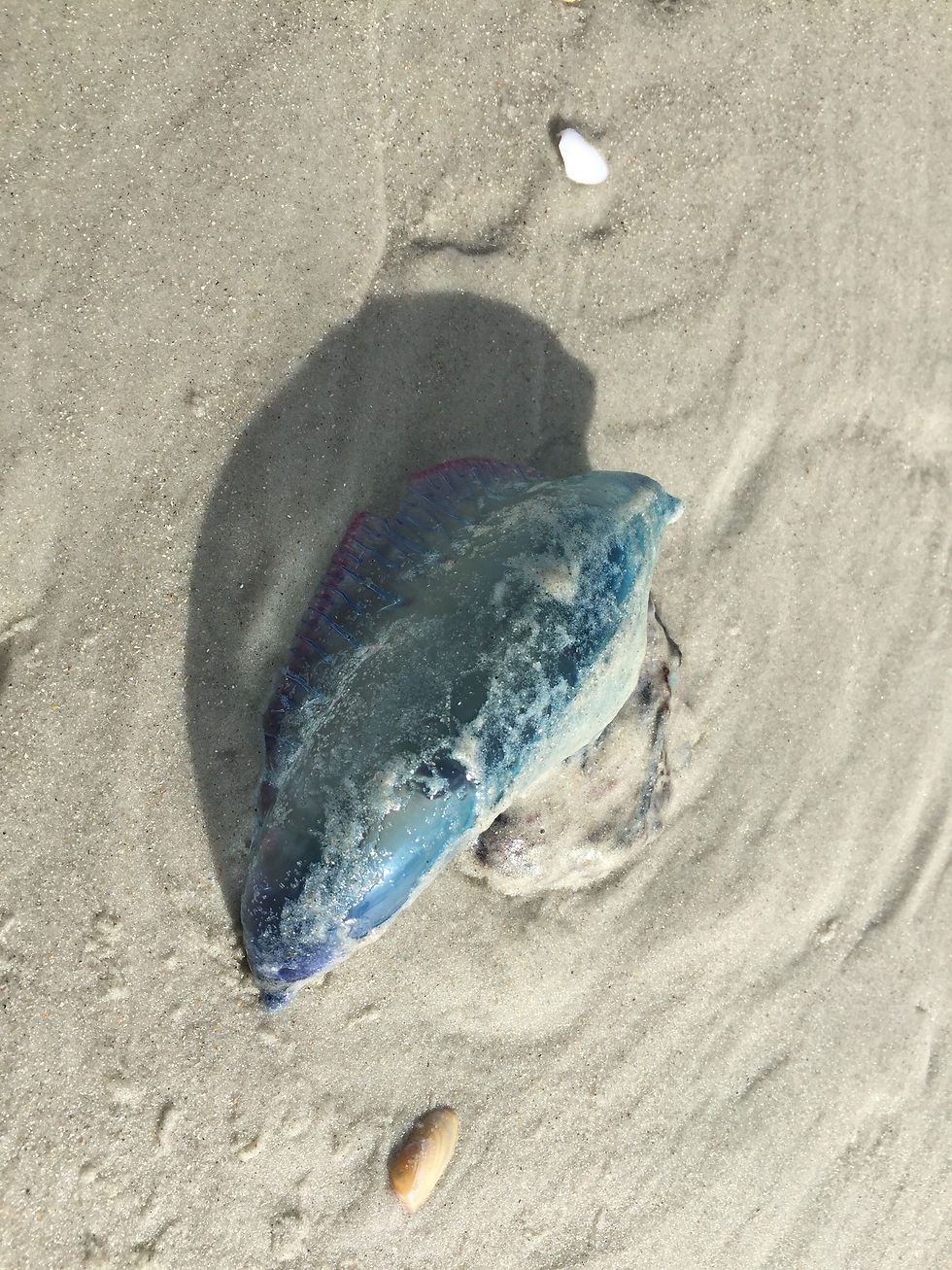 The beach was very busy, but not packed. We found a nice spot and set up all our stuff. Kizmet was pretty hot, so I took her for a walk down by the water. We walked down to an area where there were no people and I found an oyster shell and threw it in the water for her to chase a few time. When I looked up I saw the Sheriff driving down the beach and quickly put her back on leash - oops. He didn’t say anything to me, but she is supposed to be on leash. I saw a dead jellyfish, it was clear on top and bright blue on the bottom. I went back to see if Isaac wanted to check it out and everyone came with me. It was pretty cool, here is the picture: